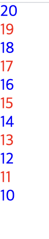 * 마지막으로, 20부터 10까지의 숫자 중 짝수일 경우에는 파란색으로 출력되고 ,홀수 일경에는 빨간색으로 출력되도록 작성해보자.