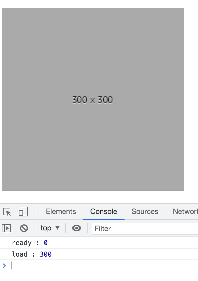 | <!DOCTYPE html> <html lang="ko"> <head> <meta charset="UTF-8"> <title> 이벤트 </title> <script src="js/jquery.js"></script> <script> $(function( ) { $(document).ready(function(){ //HTML에 전체요소가 로딩되면 이벤트 핸들러가 실행된다. var h1 = $(".img1").height(); console.log("ready :", h1); //ready : 0 }); $(window).load(function(){ //외부 소스(이미지)가 완전히 로딩되면 이벤트 핸들러가 실행되며 이미지 높잇값(300)이 출력된다. var h2 = $(".img1").height(); console.log("load :", h2); //load:300 }); }); </script> </head> <body> <p> <img src="http://place-hold.it/300X300" class="img1"> </p> </body> </html> |