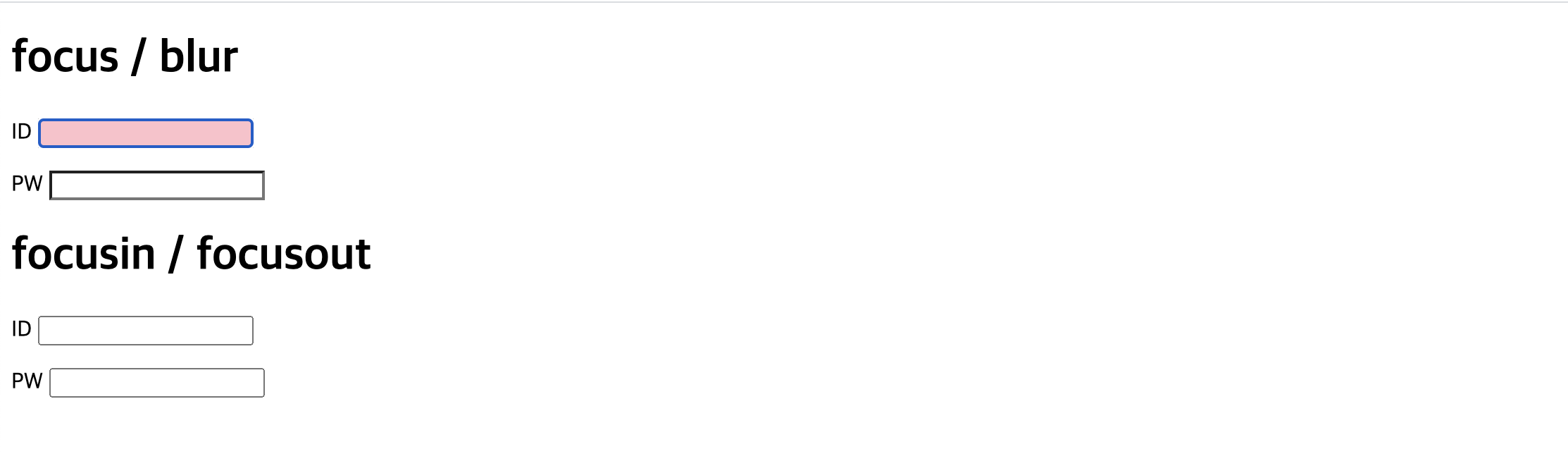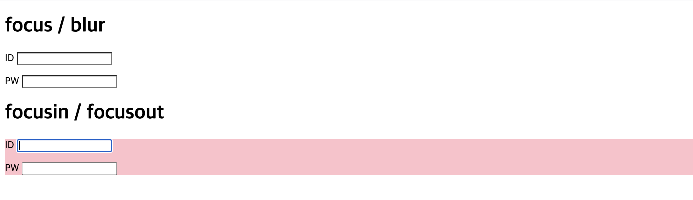 | <!DOCTYPE html> <html lang="ko"> <head> <meta charset="UTF-8"> <title> 이벤트 </title> <script src="js/jquery.js"></script> <script> $(function(){ // 포커스 입력요소로 이동하면 배경색을 분홍색으로 변경하고 다른요소로 이동하면 다시 배경색을 흰색으로 변경한다. $("#user_id_1, #user_pw_1").on("focus", function(){ $(this) .css({"background-color":"pink"}); }); $("#user_id_1, #user_pw_1").on("blur", function(){ $(this) .css({"background-color":"#fff"}); }); $("#frm_2").on("focusin", //포커스가 이벤트 대상 요소에서 입력 요소로 이동하면 이벤트가 발생한 요소의 배경색을 분홍색으로 한다. function(){ $(this) .css({"background-color":"pink"}); }); $("#frm_2").on("focusout", function(){ $(this) .css({"background-color":"#fff"}); }); }); </script> </head> <body> <h1>focus / blur</h1> <form action="#"> <p> <label for="user_id_1">ID</label> <input type="text" name="user_id_1" id="user_id_1"> </p> <p> <label for="user_pw_1">PW</label> <input type="password" name="user_pw_1" id="user_pw_1"> </p> </form> <h1>focusin / focusout</h1> <form action="#" id="frm_2"> <p> <label for="user_id_2">ID</label> <input type="text" name="user_id_2" id="user_id_2"> </p> <p> <label for="user_pw_2">PW</label> <input type="password" name="user_pw_2" id="user_pw_2"> </p> </form> </body> </html> |