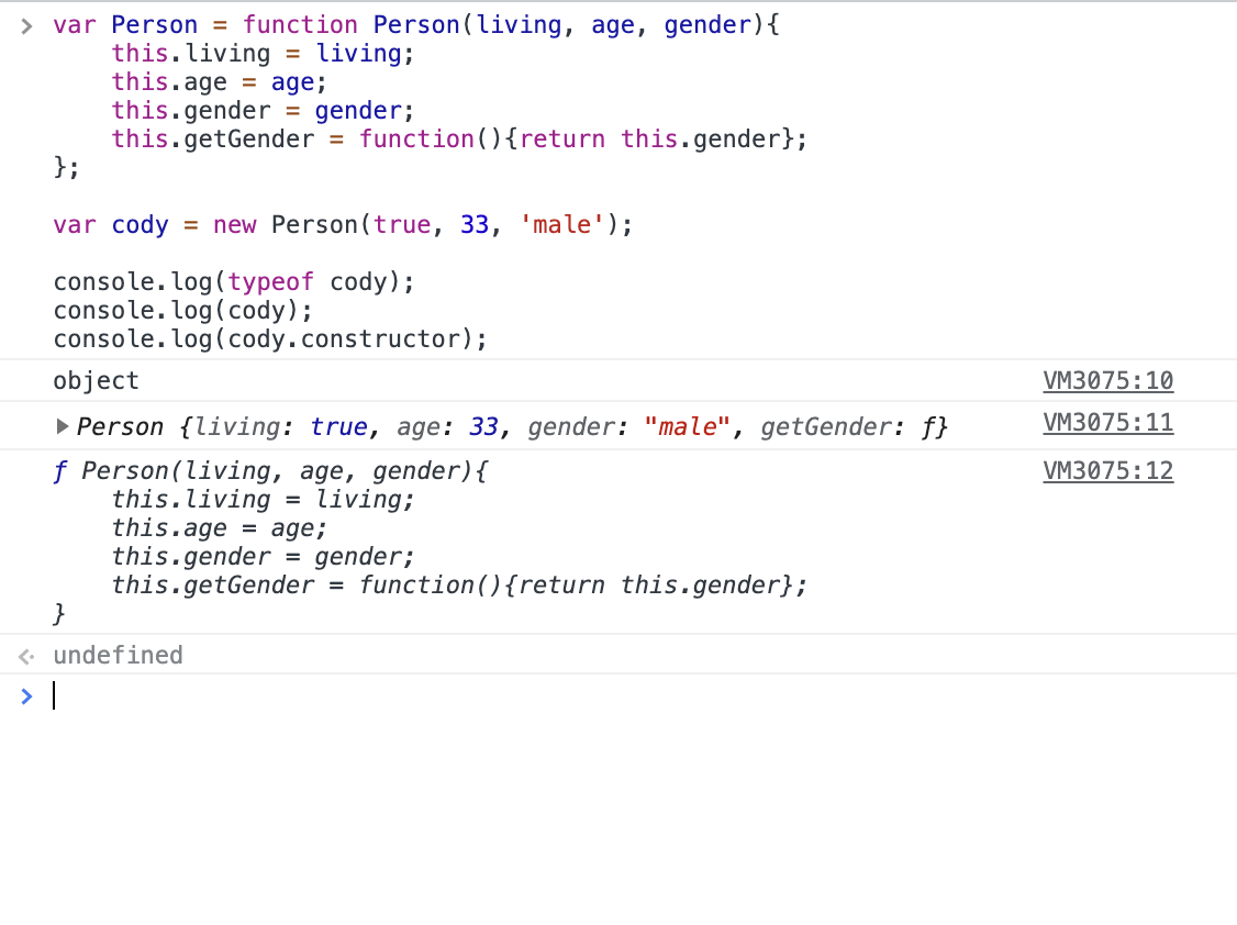var Person = function Person(living, age, gender){