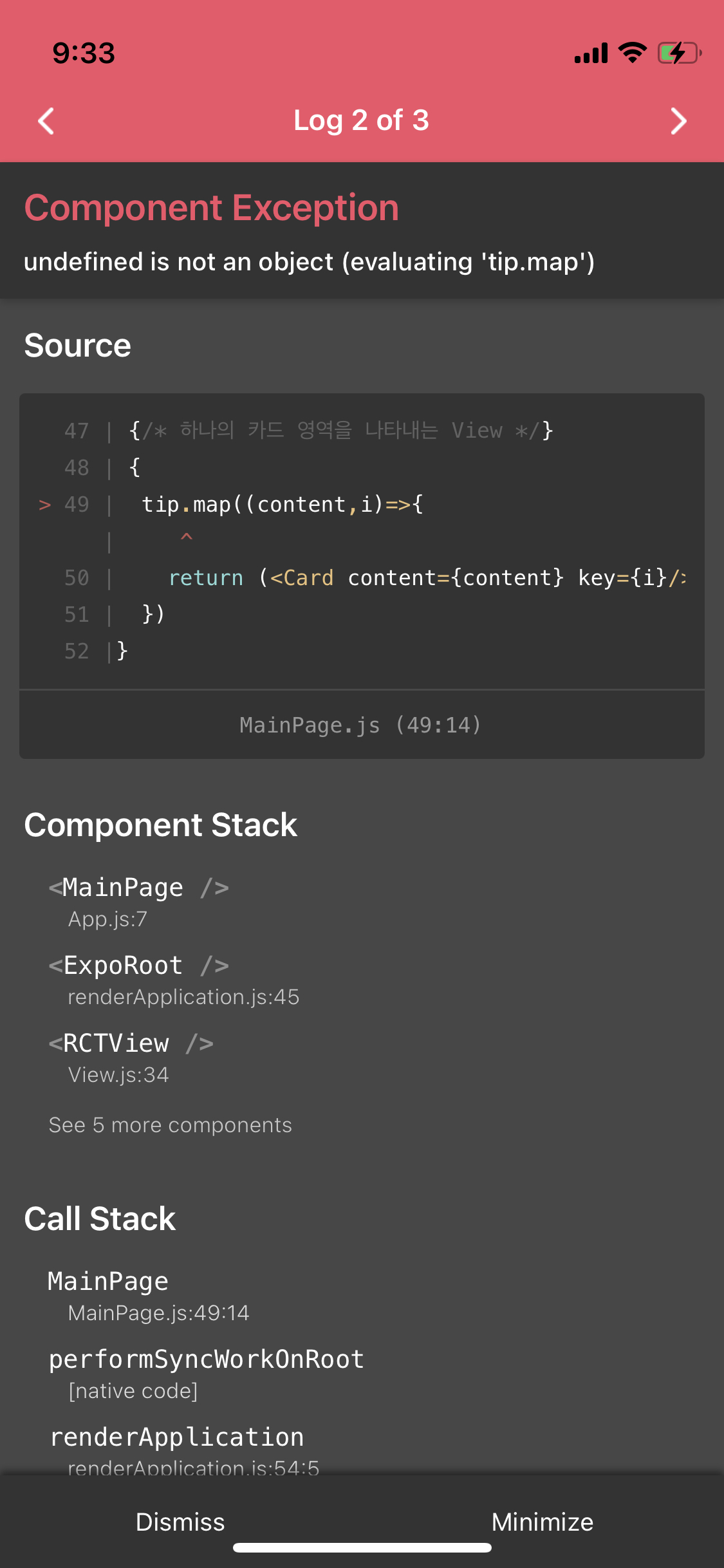 현재 강의에서 작성한 코드로 봤을때는 useState에는 초기값은 빈리스트로 state에 값이 없는 상태고 아무것도 없는 빈 리스트에서 tip를 꺼내서 반복문을 돌리려고하니까 오류가 발생했다.