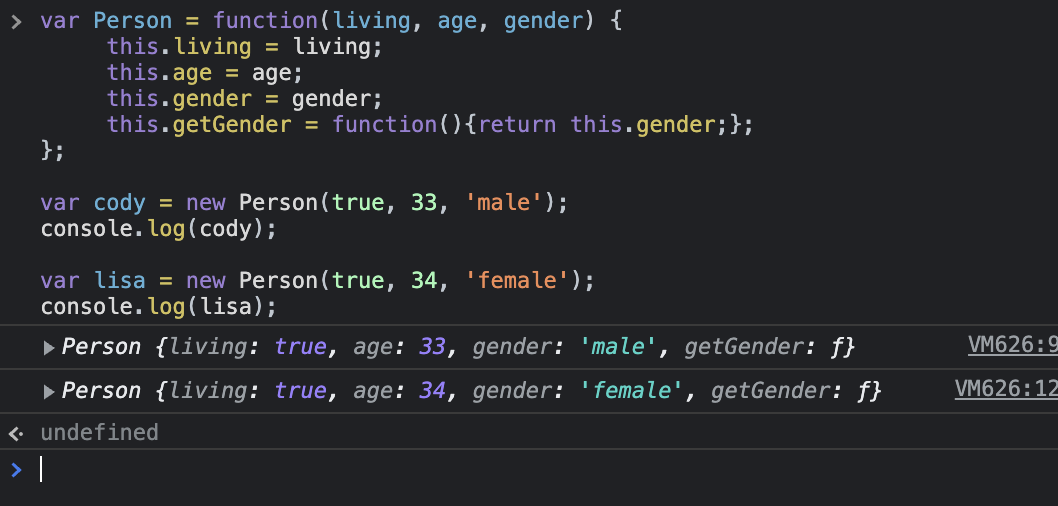 2) 생성자 함수를 new키워드와 함께 사용하면 생성자 함수 내부에서 정의된 속성과 값을 가지는 개체를 만들어 낸다.