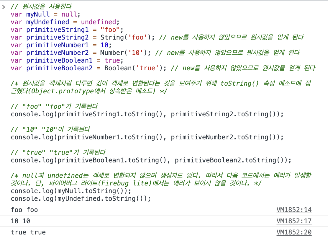 위의 예제에서 모든 원시값(null,undefined 제외)은 객체로 변환되어 toString() 메소드를 사용할 수 있었으며,