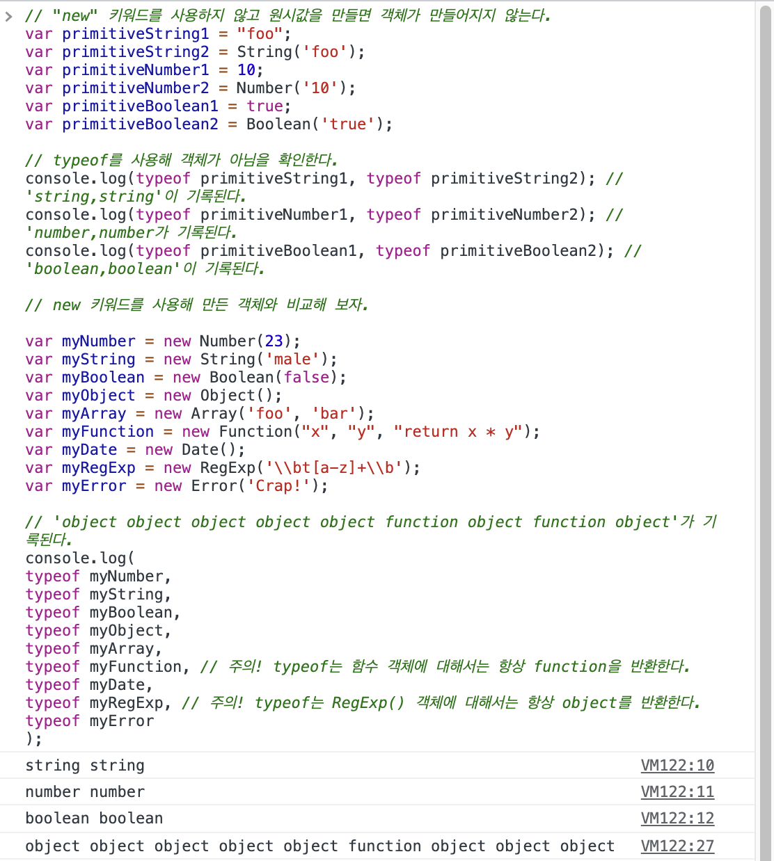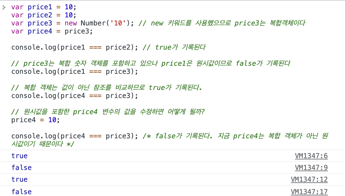 다음은 원시값과 자바스크립트 네이티브 객체를 비교하는 코드이며, 코드로 알아보자.