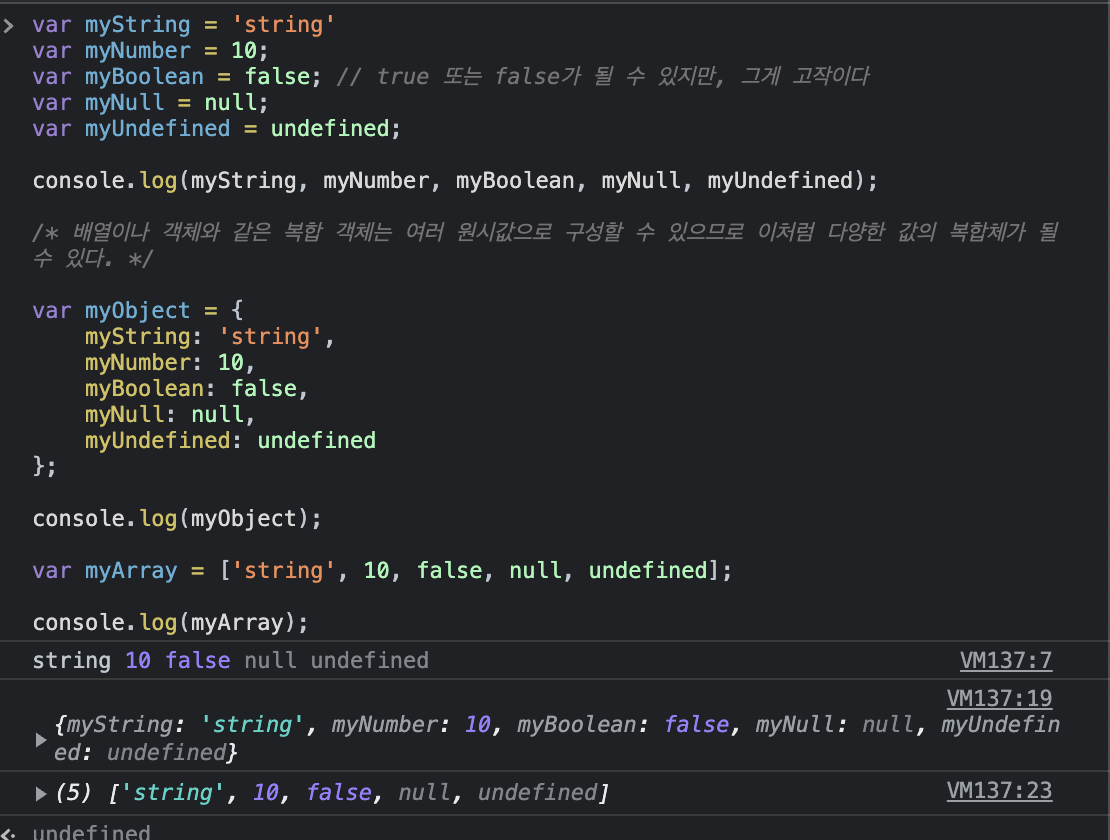 원시값은 자바스크립트에서 사용할 수 있는 데이터 및 정보의 가장 단순한 형태라고 보면된다.