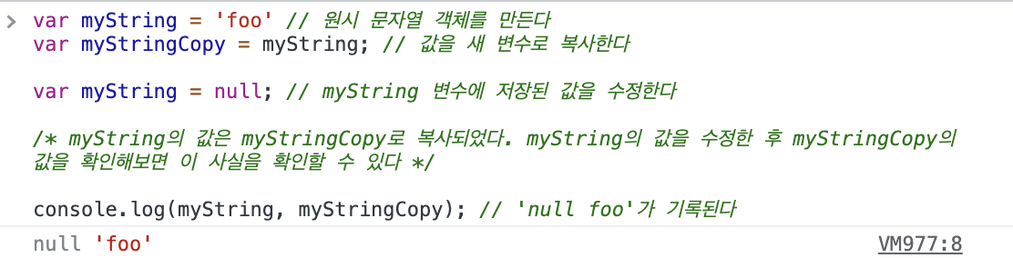예를들어, 'foo'를 myString이라는 변수에 저장하면 'foo'라는 값이 말 그대로 메모리에 저장된다는 뜻이다.