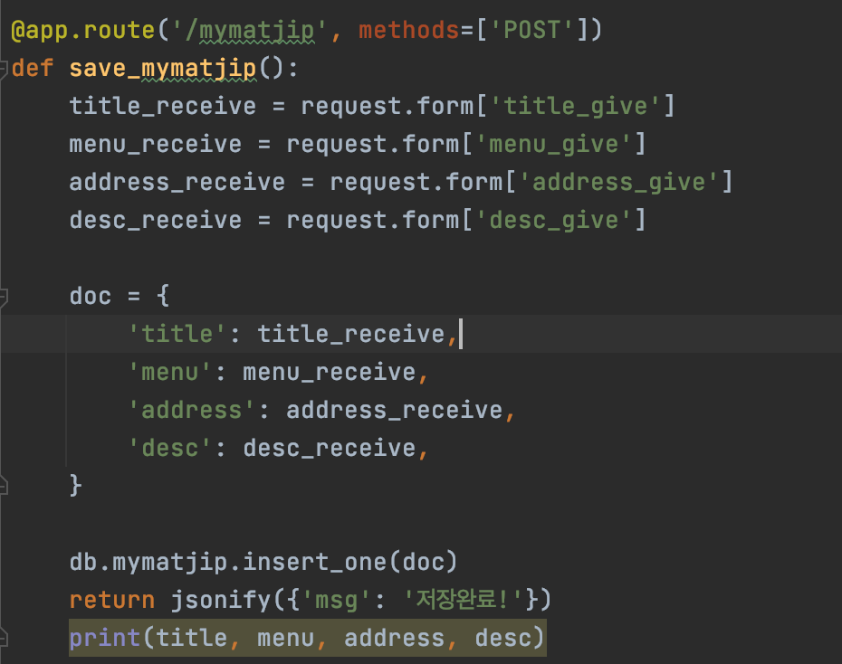 DB에 저장할때는 insert_one 이라고 지칭을 해주면된다. 그렇게되면 doc에서 지정한 이름으로