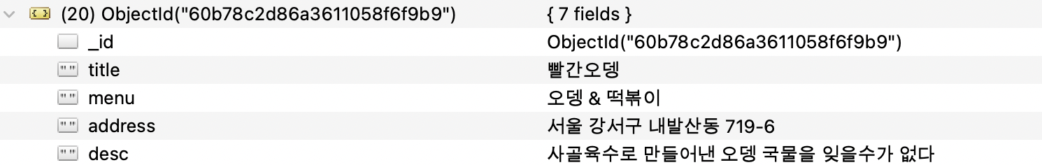 이후 저장하기버튼을 클릭할때마다 입력한 값을 각각 "title,menu,address,desc"에 저장을 했다.