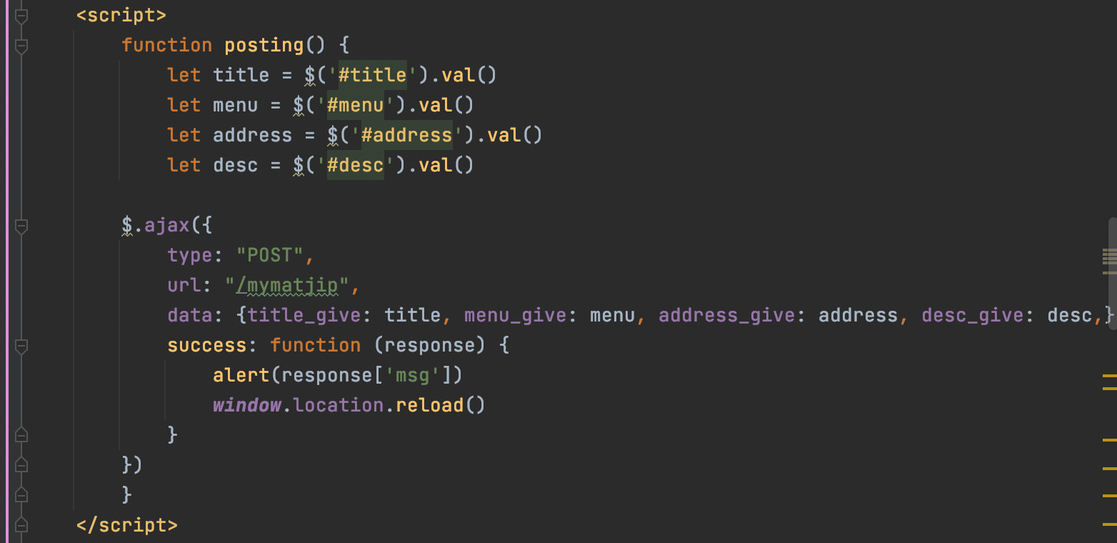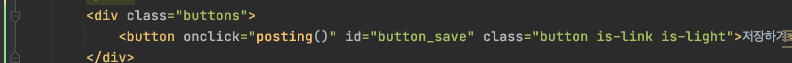 우선은 저장하기버튼에 onclick="posting()"를 함수를 지정해주었다.