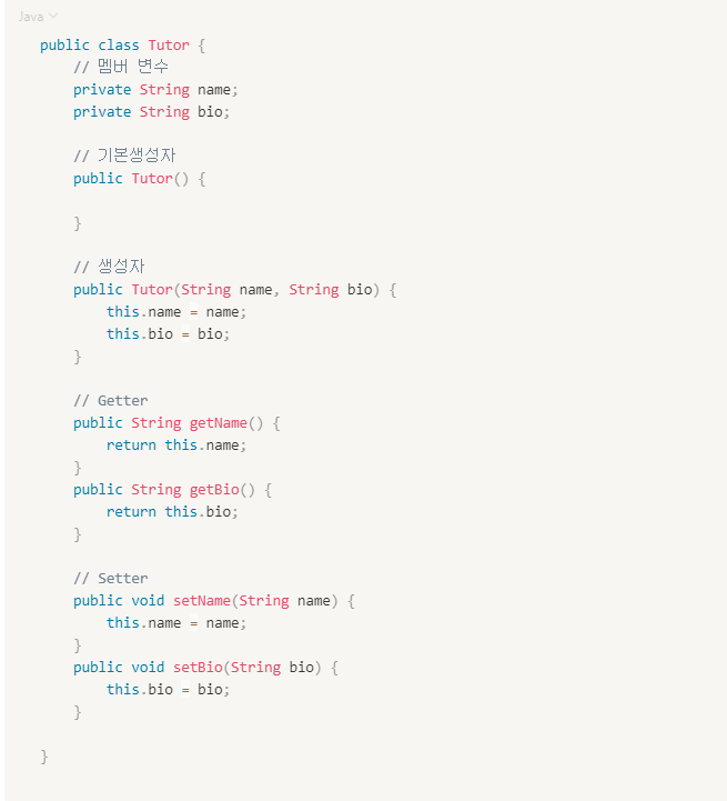 이때, private으로 구분했을때 필요한 매소드가 Getter , Setter 다.