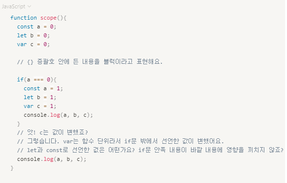 const: block 단위(상수: 한번 선언한 값은 바꿀 수 없습니다.)