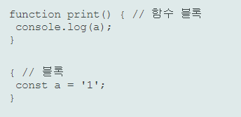 함수를 선언할 때 중괄호로 함수 본문을 둘러싸게 되는데 이부분을 블록이라고 할 수 있다.