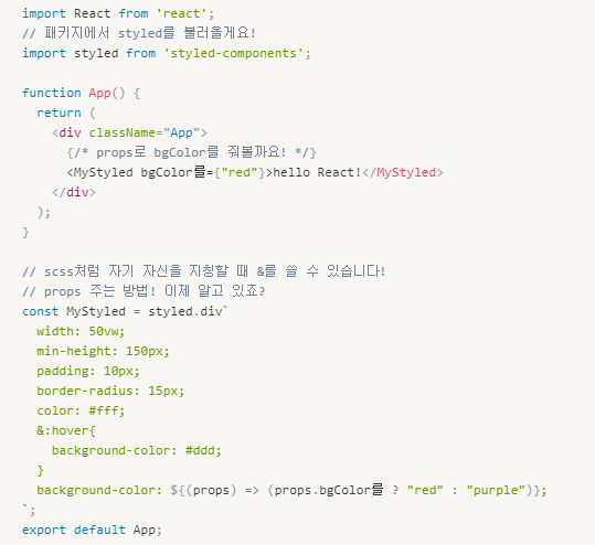 <MyStyled bgColor를={"red"}>hello React!</MyStyled>